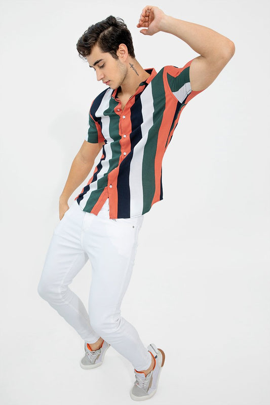 Slim Fit Color Block Cut Away Collar Casual Shirt